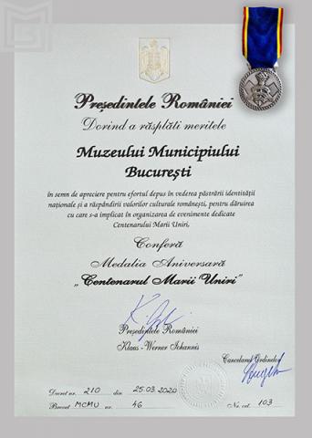 Muzeul Municipiului Bucureşti a primit recent Medalia Aniversară 'Centenarul Marii Uniri'....