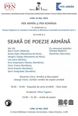 PEN ARMẬN şi PEN ROMẬNIA vă invită la o “Seară de Poezie Armână”, în data de 22 mai 2023, la ora 18:00,...